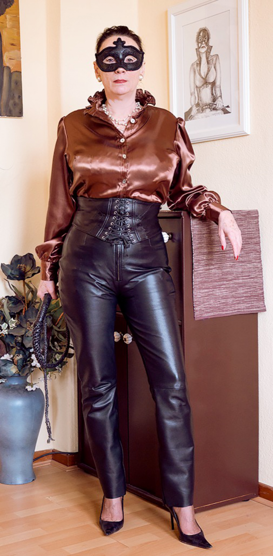 Auch das ist wieder ein sehr schönes Solo Video der Herrin, in dem sie sich in einer wunderschönen braunen, glänzenden Satinbluse mit Lederhose und Lederjacke präsentiert.