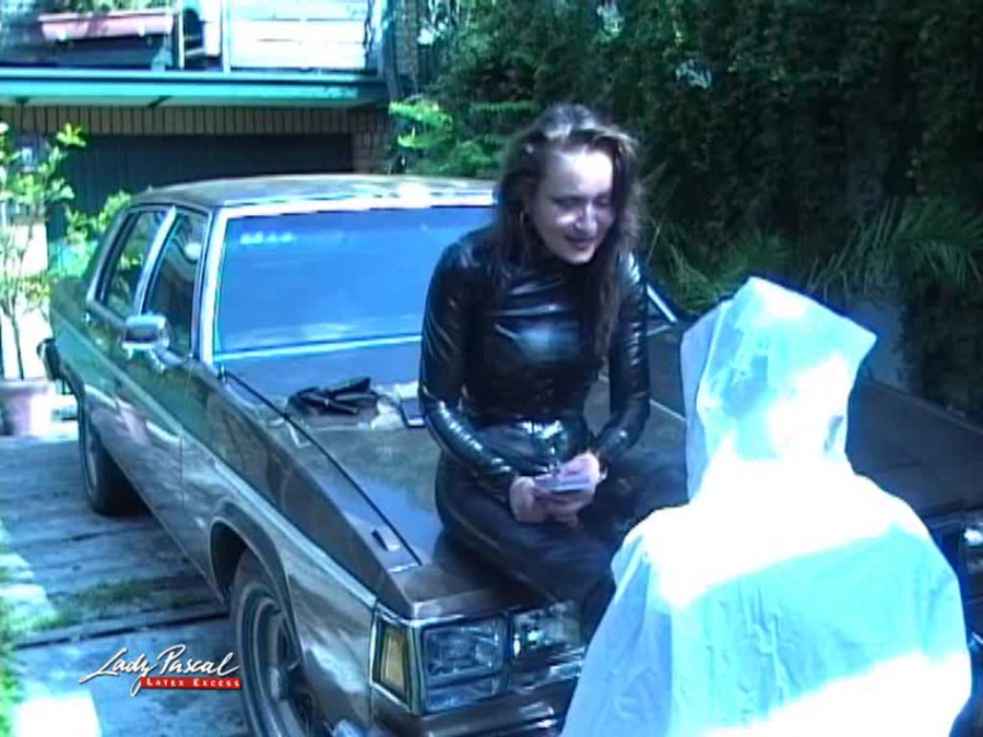 Ich hatte mir heute etwas hinterhältiges ausgedacht: In der warmen Sonne durfte mein Sklave über seinem Latex-Ganzanzug zusätzlich ein geschlossenes Plastikhemd anziehen. Während ich ihn über seine Sexpraktiken und seine perversen Phantasien befrage, ringt er in mehrfacher Hinsicht nach Luft...
